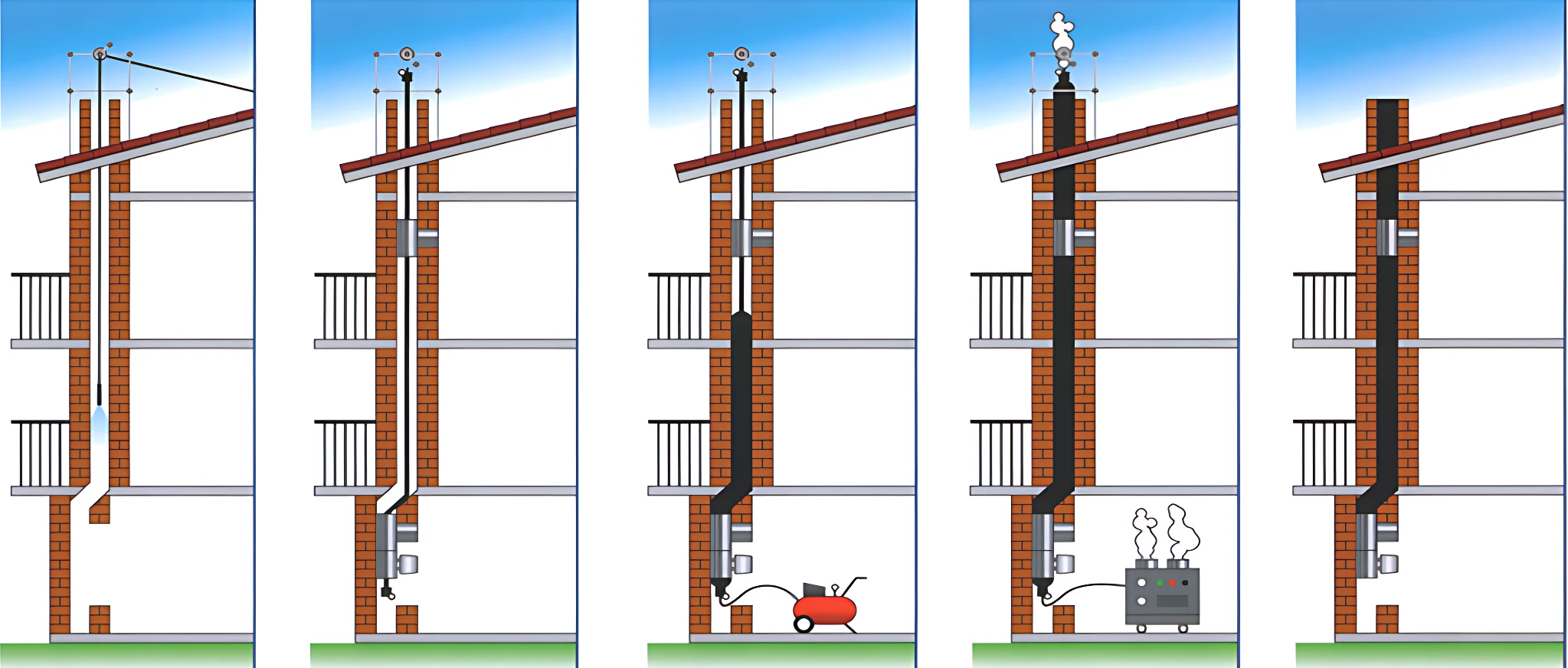 1. Videoispezione > 2. Applicazione della boccola inferiore e superiore con manometro > 3. Immissione dell’aria forzata > 4. Immissione del vapore > 5. Taglio della guaina in eccesso.
